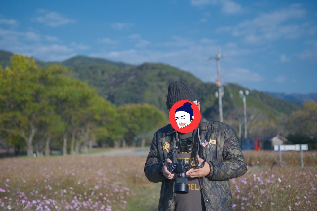 高知県越知町宮の前公園キャンプ場にてデカいカメラを持つ僕(撮影:ちぅ太)